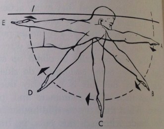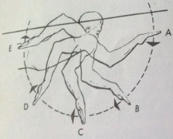 "The straight arm pull is better than the dropped elbow arm pull so far as effectiveness is concerned, but at points A and B the force applied downward is too great, and at points D and E the force applied upward is too great. This tends to push the swimmer upward at points A and B and downward when the hand is at D and E.
