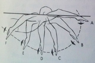 "The best pull is that which will minimize the dropped upward and downward components of the straight arm pull and provides a greater push backwards. It begins almost as a straight arm pull except that the elbow is higher. The elbow bends during the pull and then nearly straightens as the pull finishes.”